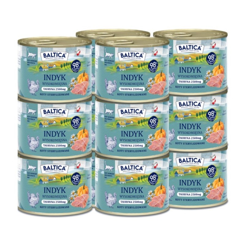 Skład: 98% indyk (63% mięso, 25% bulion z indyka, 5% nerki, 5% wątroba), 1% minerały, 0,5% dynia, 0,4% marchew, 0,1% rumianek.