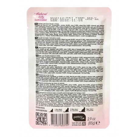 Kompletna mokra karma z prawdziwymi kawałkami kurczaka i tuńczyka w pysznym sosie. Dostępna w wygodnym opakowaniu w formie saszetki.