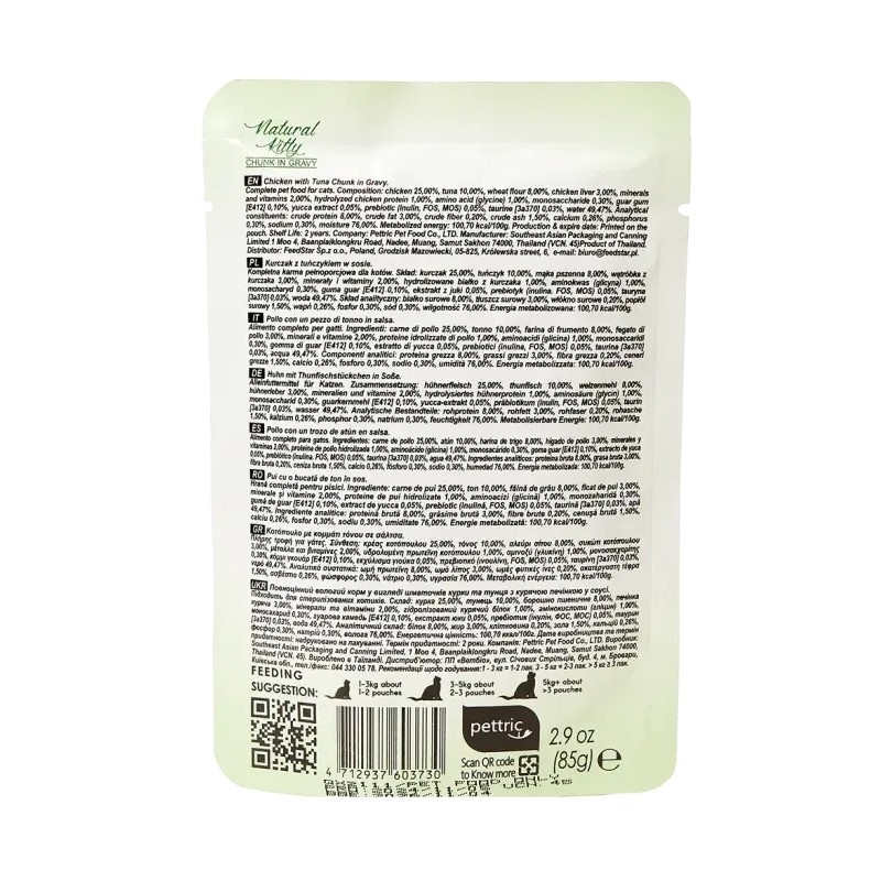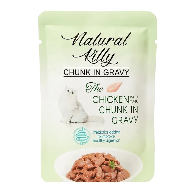 Kompletna mokra karma z prawdziwymi kawałkami kurczaka i tuńczyka w pysznym sosie. Dostępna w wygodnym opakowaniu w formie saszetki.