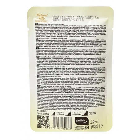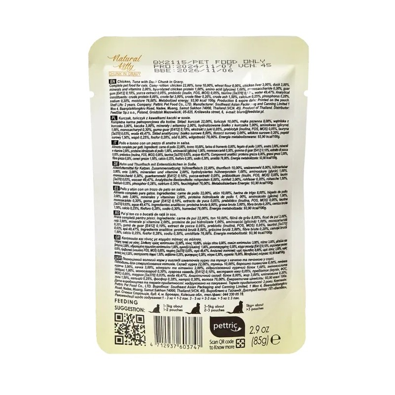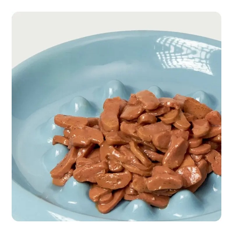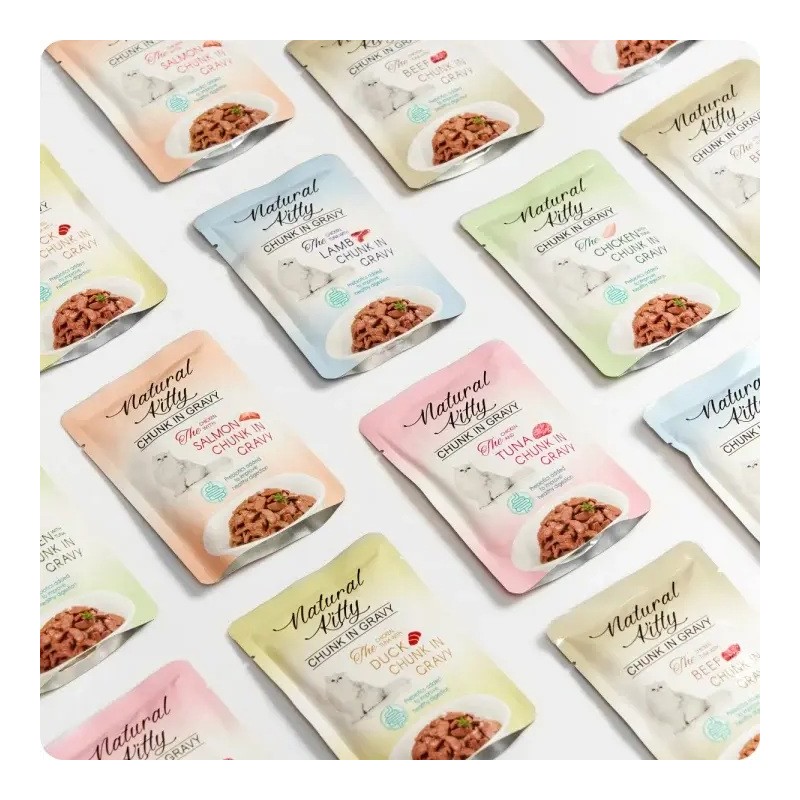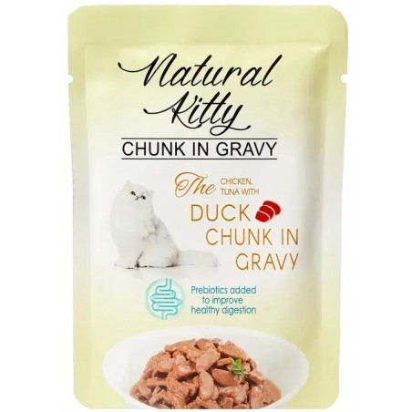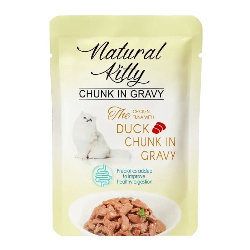 Kompletna mokra karma z prawdziwymi kawałkami kurczaka, tuńczyka, kaczki i wątróbki drobiowej w pysznym sosie. Dostępna w wygodnym opakowaniu w formie saszetki.