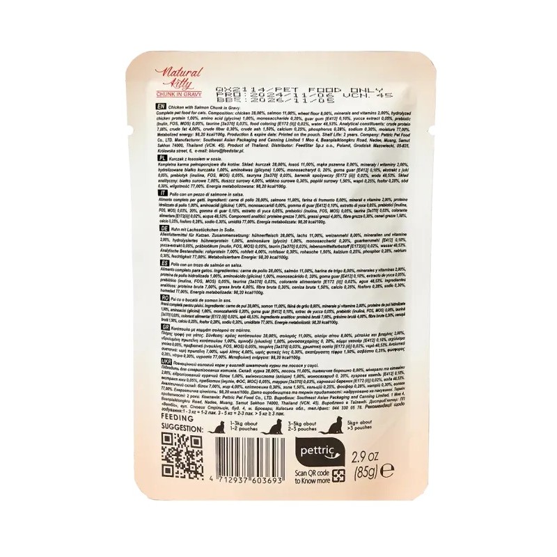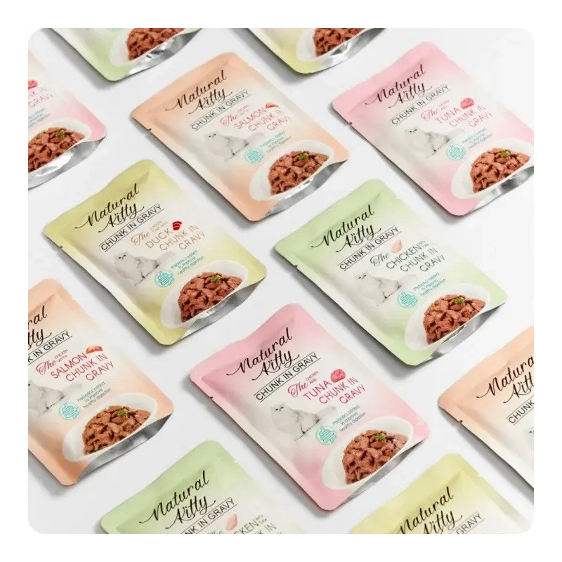 Kompletna mokra karma z prawdziwymi kawałkami kurczaka, tuńczyka i wątróbki wołowej w pysznym sosie. Dostępna w wygodnym opakowaniu w formie saszetki.