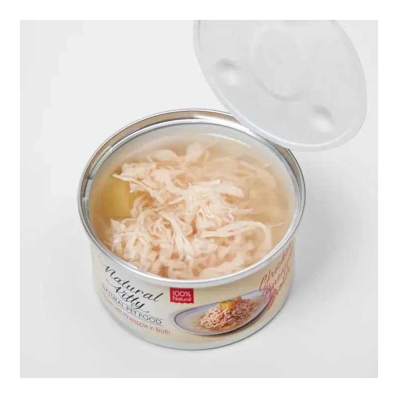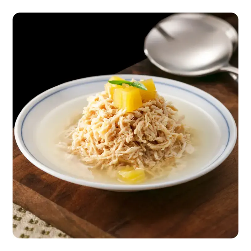 Skład: Bulion z kurczaka 67,60%, kurczak 30,00%, ananas 2,40%.