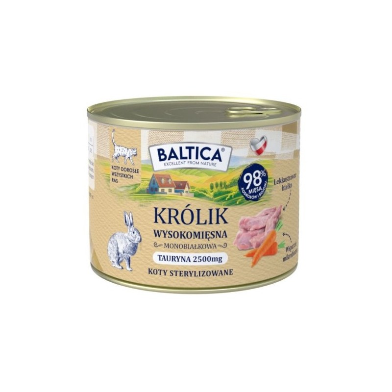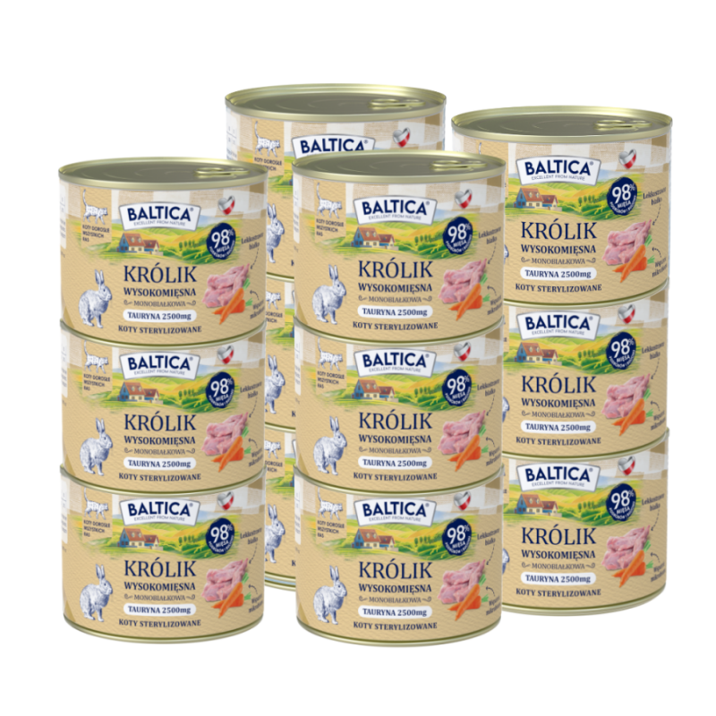 Bezzbożowa, monoproteinowa lekkostrawna uczta stworzona na bazie wybornego mięsa królika. Karma mokra dla kotów opracowana z myślą o codziennym, świadomym żywieniu osobników dorosłych każdej rasy, w tym również po sterylizacji, z ograniczoną aktywnością oraz z wrażliwym przewodem pokarmowym.