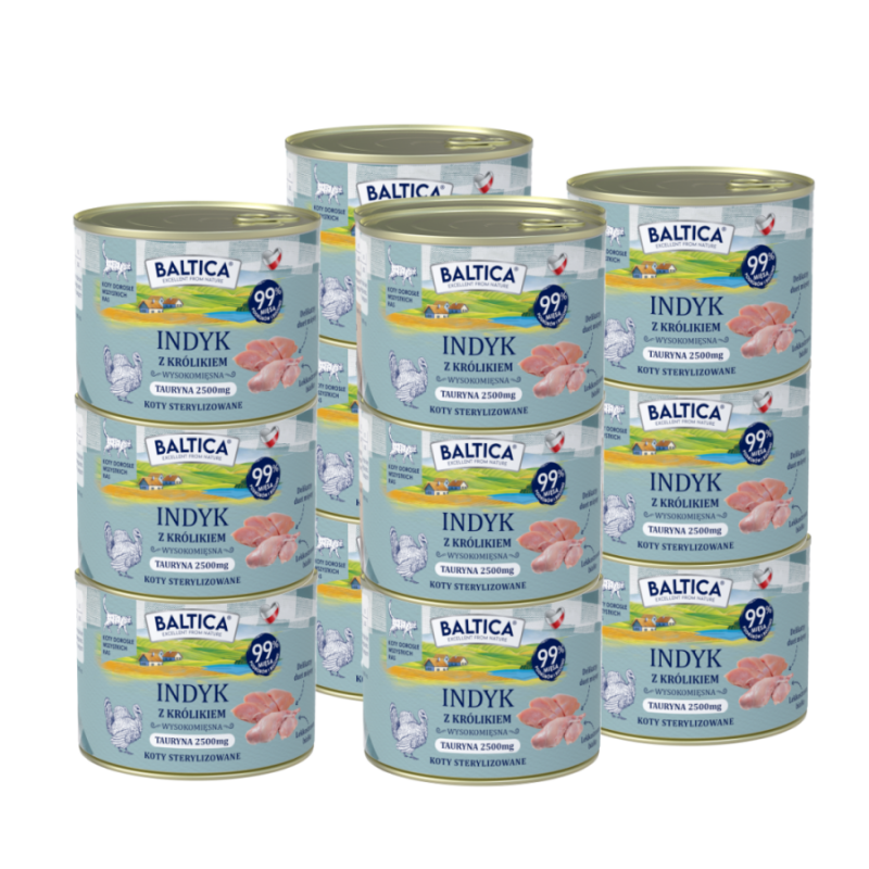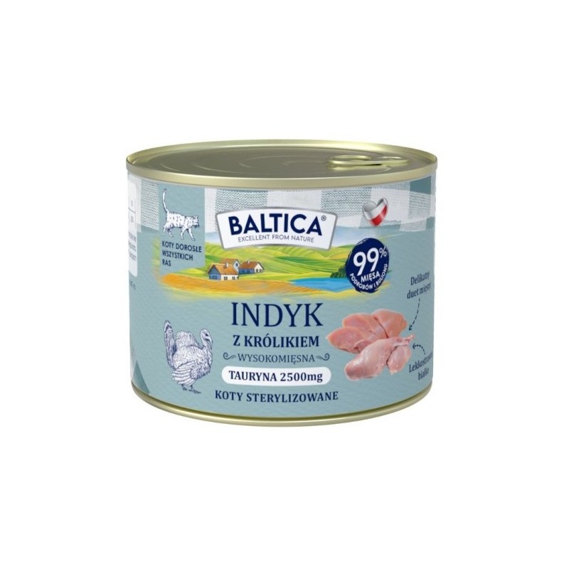 Bezzbożowa duobiałkowa lekkostrawna uczta stworzona na bazie delikatnego mięsa indyka oraz królika. Karma mokra dla kotów opracowana z myślą o codziennym, świadomym żywieniu osobników dorosłych każdej rasy, w tym również po sterylizacji, z ograniczoną aktywnością oraz z wrażliwym przewodem pokarmowym.