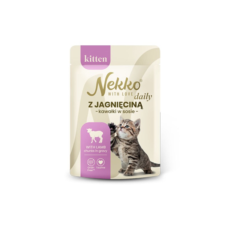Nekko Daily Kitten Kawałki Jagnięciny w sosie to pełnoporcjowa karma mokra dla kociąt. Zawiera wszystkie niezbędne substancje odżywcze i minerały, dlatego idealnie sprawdzi się jako codzienny posiłek.