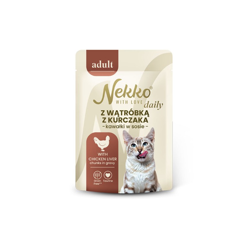 Nekko Daily Adult Wątróbka z kurczaka w sosie to pełnoporcjowa karma mokra dla dorosłych kotów. Zawiera wszystkie niezbędne substancje odżywcze i minerały, dlatego idealnie sprawdzi się jako codzienny posiłek.