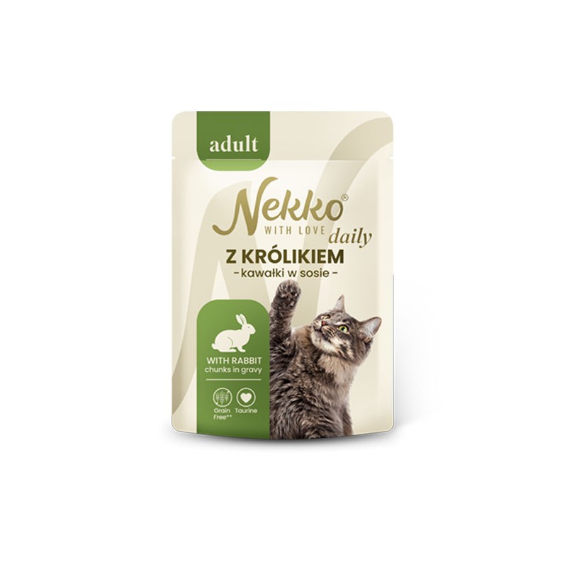 Nekko Daily Adult z Królikiem w sosie to pełnoporcjowa karma mokra dla dorosłych kotów. Zawiera wszystkie niezbędne substancje odżywcze i minerały, dlatego idealnie sprawdzi się jako codzienny posiłek.