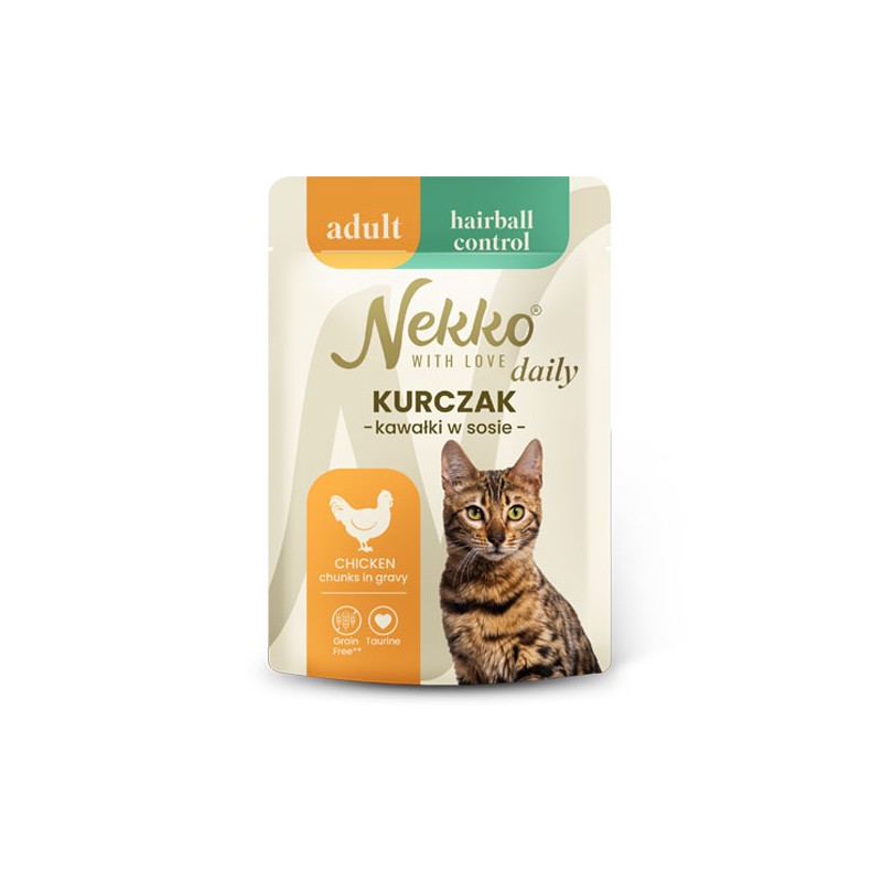 Nekko Daily Adult Hairball Control Kurczak w sosie to pełnoporcjowa karma mokra dla dorosłych kotów. Zawiera wszystkie niezbędne substancje odżywcze i minerały, dlatego idealnie sprawdzi się jako codzienny posiłek.
