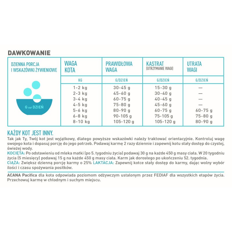 Acana Pacifica to prawdziwy ocean słonowodnych ryb: pełny śledzia, morszczuka, błękitka, flądry, karmazyna oraz makreli. Kuszący rybny smak jeszcze bardziej wzmocniono liofilizowaną wątrobą dorsza. Ta kompozycja wodnych smaków czyni z udomowionych drapieżników prawdziwych łowców wód i oceanów. Wyjątkowa smakowitość jedzenia sprawia, że koty chętnie zjadają wydzielony posiłek, nie mogąc już doczekać się kolejnego.