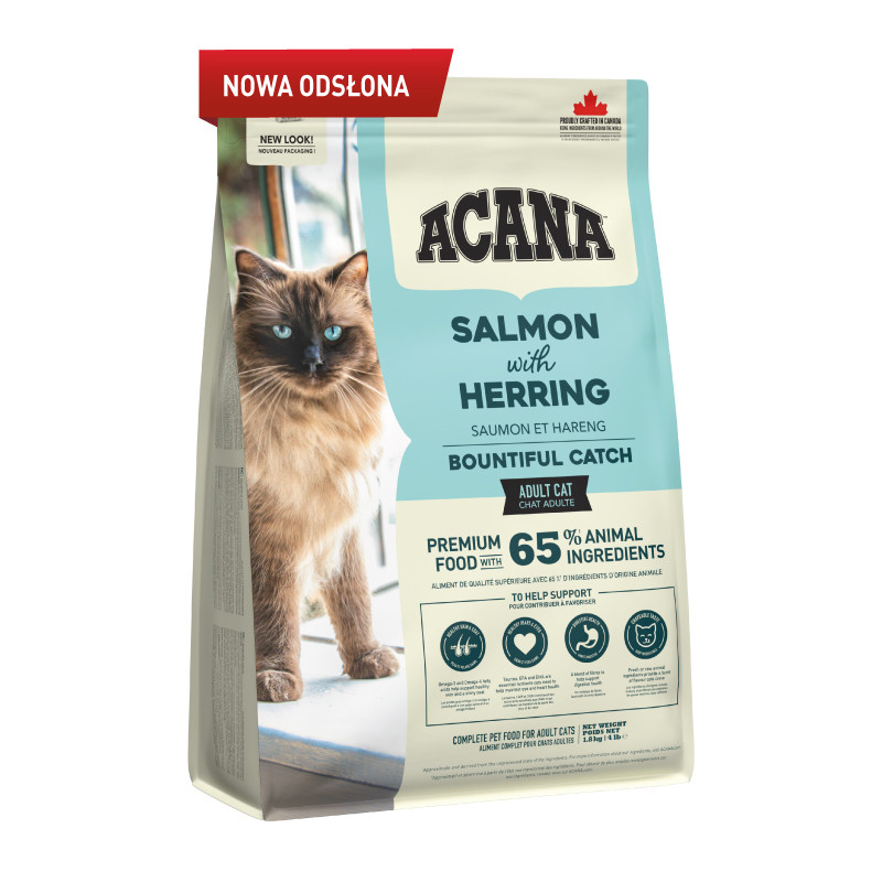 W ACANA Bountiful Catch Twój mruczący przyjaciel upoluje aż cztery gatunki ryb: łososia, śledzia, morszczuka i pstrąga.