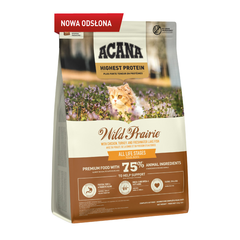 Karma bezzbożowa Acana Wild Prairie oferuje Twojemu kotu wysokiej jakości składniki zwierzęce, takie jak kurczak i indyk chowane na wolnym wybiegu, ryby słodkowodne i jaja z chowu ściółkowego. Dzięki temu Acana jest bogata w białko i składniki odżywcze pochodzące z mięsa mięśniowego, narządów wewnętrznych oraz chrząstek i kości obecnych w proporcjach WholePrey w naszym jedzeniu. To sprawia, że Twój kot otrzymuje wszystko, czego potrzebuje do osiągnięcia pełni zdrowia.