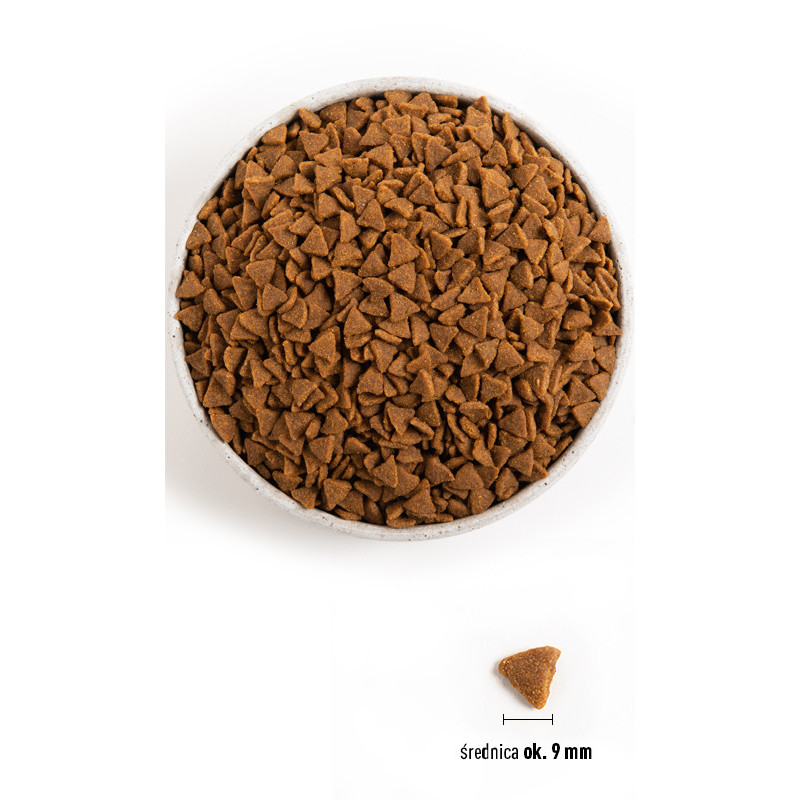 Skład analityczny: Surowe białko 37%, Oleje i tłuszcze 14%, Surowy popiół 9%, Surowe włókno 6%, Wilgotność 10%, Wapń 1,3%, Fosfor 1,0%, EPA 0,1%, DHA 0,2%, Omega-6 2%, Omega-3 0,5%, Magnez 0,1%, Tauryna 0,1%.