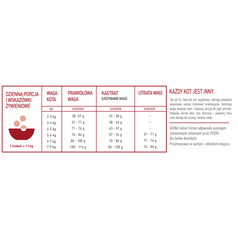 ACANA Indoor Entrée to idealna formuła dla domowych drapieżników. Koty niewychodzące również wymagają żywienia opartego na mięsie, dlatego Indoor Entrée zawiera aż 65% składników mięsnych w odżywczych proporcjach WholePrey. Dzięki mniejszej zawartości tłuszczu, a tym samym kalorii, pozwala utrzymać formę kotom niewychodzącym.