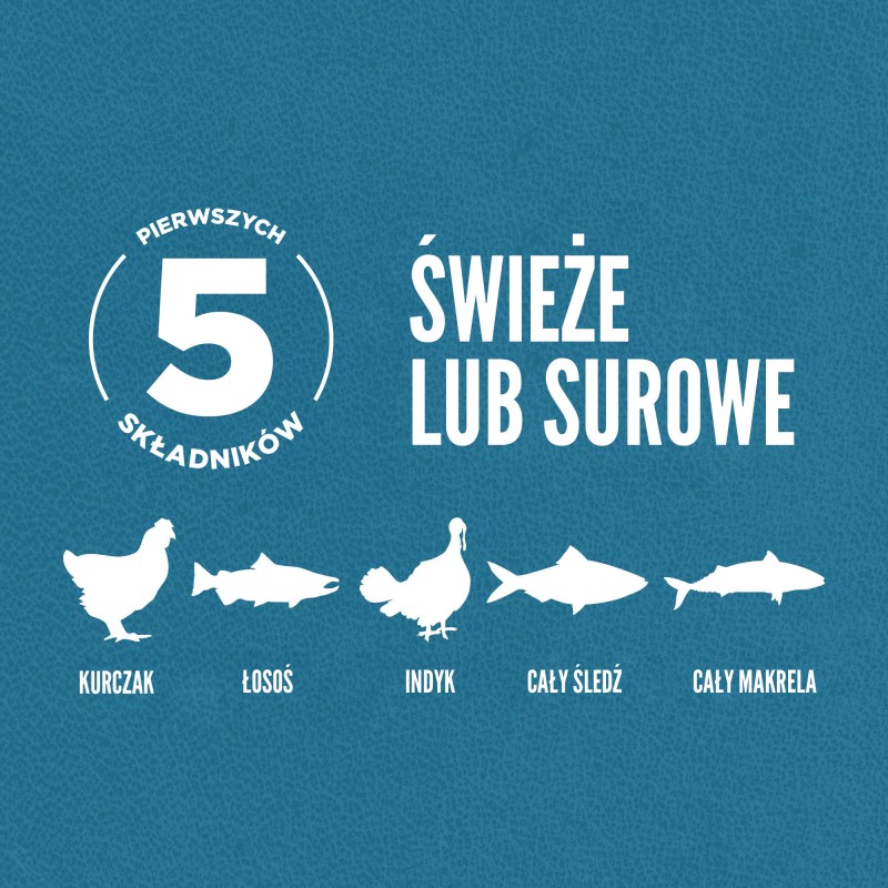Skład: Świeże mięso kurczaka (32%), surowy łosoś (5%), surowe mięso indyka (5%), surowy cały śledź (5%), surowa cała makrela (5%), świeże organy kurczaka (wątroba, serce) (4,5%), surowa wątroba indyka (4%), świeże jaja (4%), dehydratyzowany kurczak (4%), dehydratyzowany indyk (4%), dehydratyzowany śledź (4%), dehydratyzowana wątroba kurczaka (4%), dehydratyzowane jaja (4%), surowe mięso królika (4%), cała czerwona soczewica, cała fasola pinto, cała zielona soczewica, cała ciecierzyca, cała fasola biała, cały groch, skrobia grochowa, zmielona trawa miskant, olej z rdzawca (1%), tłuszcz z kurczaka (0,5%), świeża cała dynia, świeża cała dynia piżmowa, suszony kelp, suszony korzeń cykorii, świeże całe jabłka, świeża cała marchew, świeże całe gruszki, świeża cała cukinia, suszone drożdże browarnicze, hydrolizowane drożdże, świeże liście buraków, świeży jarmuż, świeży szpinak, świeże liście rzepy, cała żurawina, całe borówki, całe jagody saskatoon, korzeń łopianu, lawenda, korzeń prawoślazu lekarskiego, ostropest plamisty, owoce dzikiej róży, kurkuma.