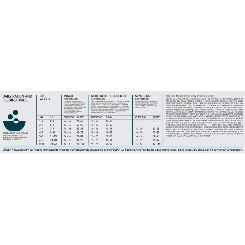 ORIJEN Guardian 8 to odżywcze jedzenie dla dorosłych kotów opracowany specjalnie, aby odpowiedzieć na 8 kluczowych potrzeb kotów poprzez dostarczanie organizmowi wysokiej jakości składników odżywczych. Ze względu na bogactwo świeżych i surowych składników Whole Prey, udział dodatkowej suplementacji jest minimalny.