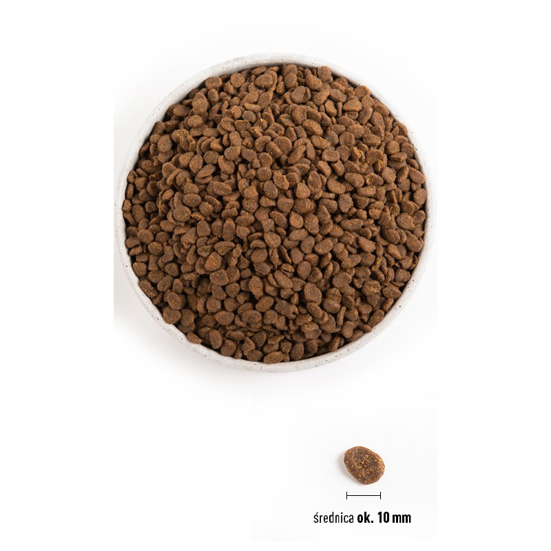 Skład analityczny: Białko surowe 40%, Tłuszcze surowe 19%, Włókno surowe 3%, Popiół surowy 9%, Wilgotność 10%, Wapń 1,6%, Fosfor 1,2%, DHA 0,8%, EPA 0,5%, Omega-6 2,1%, Omega-3 2,1%, Magnez 0,1%, Tauryna 0,3%.