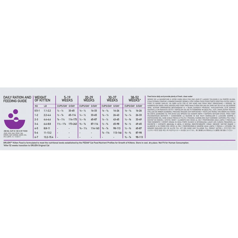 Jedzenie ORIJEN Kitten zawiera różnorodność świeżych mięs, podanych w Biologicznie Odpowiednich proporcjach WholePrey, dzięki czemu odżywia Twojego kociaka, zapewniając mu zdrowie, siłę i witalność.