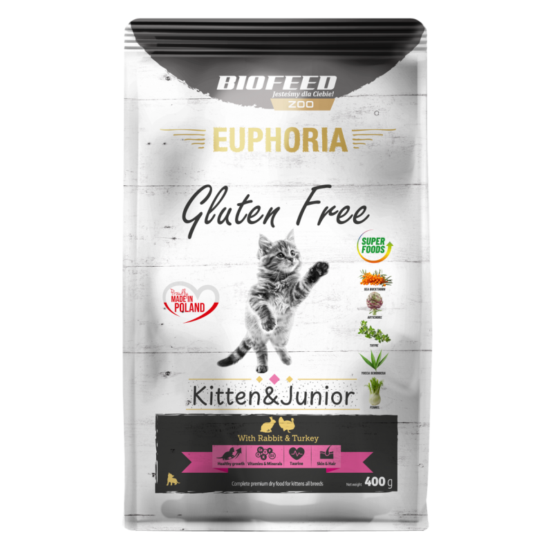 Biofeed Euphoria Gluten Free Cat Kitten & Junior Turkey & Rabbit Indyk z Królikiem to sucha karma dla kociąt do 12. miesiąca życia, wspierająca zrównoważony rozwój młodych organizmów.