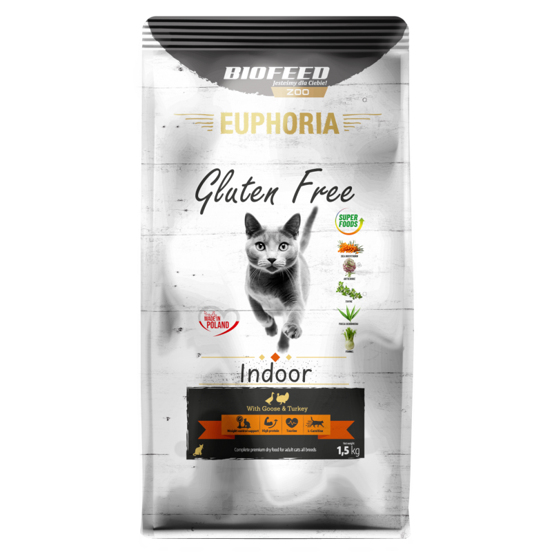 Biofeed Euphoria Gluten Free Cat Indoor to karma sucha dla kotów z indykiem i z gęsią, niewychodzących, przebywających w domu i o ograniczonej aktywności fizycznej.