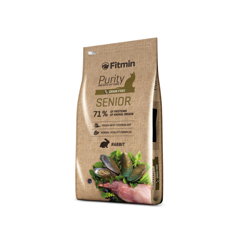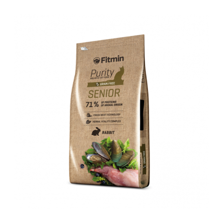 Karma Fitmin cat Purity Senior to uczta kulinarna dla Twojego kota. Znajdziesz w niej bogate proporcje świeżego mięsa z królika i jagnięciny, zioła wspierające witalność organizmu, owoce i warzywa. Nie tylko zaspokoisz potrzeby żywieniowe starzejącego się kota, ale nie będziesz musieć rezygnować ze standardów smakowych, ponieważ podarujesz mu najwyższą jakość Fitmin cat Purity Senior. To tzw. karma grain free, co oznacza, że jest bezglutenowa i zmniejsza potencjalne ryzyko reakcji alergicznych (np. na gluten pszenny i kukurydziany). Unikalny skład sprawia, że jest idealna dla wybrednych kotów, którym nie wszystko posmakuje. Dzięki niemu Twój kot będzie nie tylko zadowolony, ale i we wspaniałej kondycji. Karma zawiera mieszankę ziołową, która ma wiele właściwości dobroczynnych dla zdrowia. Karma jest produkowana przy użyciu najnowszych technologii, jest zbilansowana, zawiera dużą ilość składników pochodzenia zwierzęcego oraz pozostałych korzystnych dla zdrowia komponentów, zwłaszcza kompleks do pielęgnacji zębów, prebiotyki, chelaty i wiele innych.