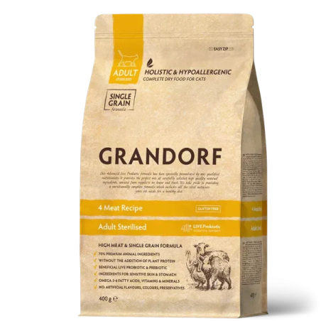 Grandorf Cat 4 Meat Sterilized wyróżnia się niską zawartością tłuszczu i wysoką zawartością białka oraz L-karnityny, które pomagają utrzymać wagę i masę mięśniową kotów kastrowanych i starszych w optymalnej formie. Miliard żywych probiotyków dziennie wspiera mikroflorę jelitową, poprawia trawienie, wchłanianie składników odżywczych i zapobiega alergiom.