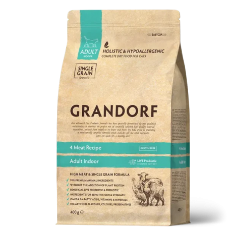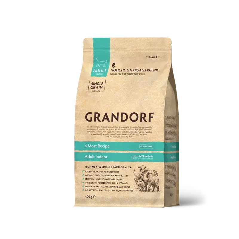 Grandorf Cat 4 Meat Indoor zawiera umiarkowaną zawartość białka i tłuszczu pomaga utrzymać optymalną wagę i masę mięśniową zwierzęcia. Starannie dobrane, naturalne, hipoalergiczne składniki pomagają zapobiegać reakcjom alergicznym i nietolerancjom pokarmowym, zapewniając zdrowie układu odpornościowego i trawiennego.
