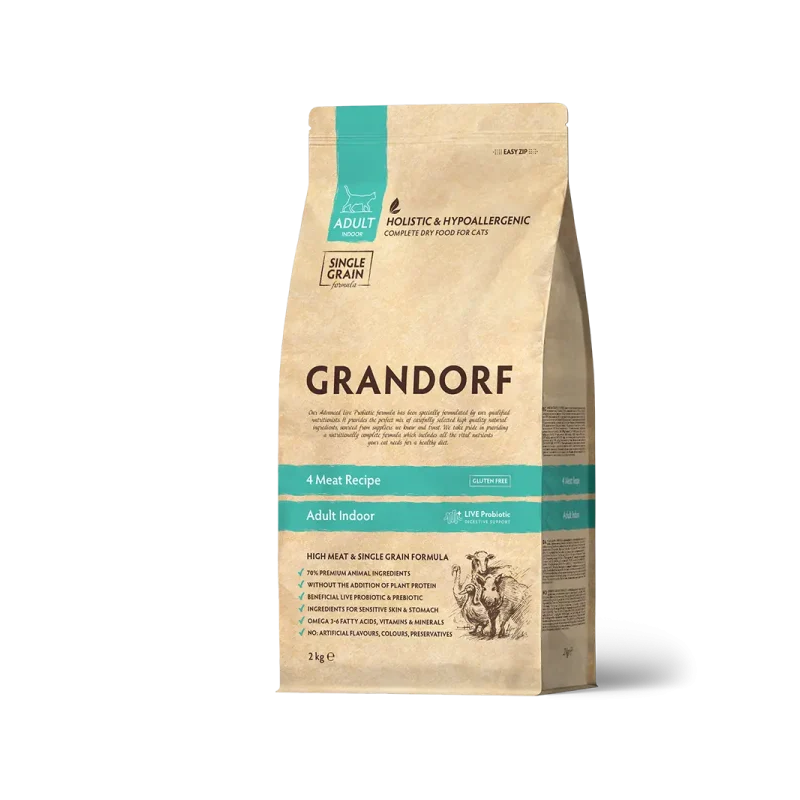 Grandorf Cat 4 Meat Indoor zawiera umiarkowaną zawartość białka i tłuszczu pomaga utrzymać optymalną wagę i masę mięśniową zwierzęcia. Starannie dobrane, naturalne, hipoalergiczne składniki pomagają zapobiegać reakcjom alergicznym i nietolerancjom pokarmowym, zapewniając zdrowie układu odpornościowego i trawiennego.