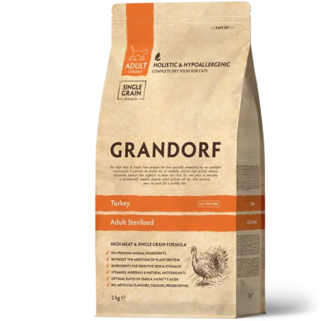 Grandorf Cat Turkey Sterilized to specjalna formuła dla zwierząt z wrażliwym układem trawiennym, która została celowo stworzona z jednym źródłem białka zwierzęcego, jednym źródłem węglowodanów i posiada krótką listą składników. Niska zawartość tłuszczu i wysoka zawartość białka pomaga utrzymać wagę i masę mięśniową u kastrowanych i starszych zwierząt w optymalnej formie.