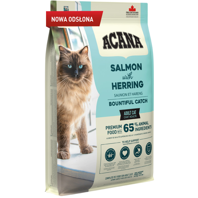 W ACANA Bountiful Catch Twój mruczący przyjaciel upoluje aż cztery gatunki ryb: łososia, śledzia, morszczuka i pstrąga.