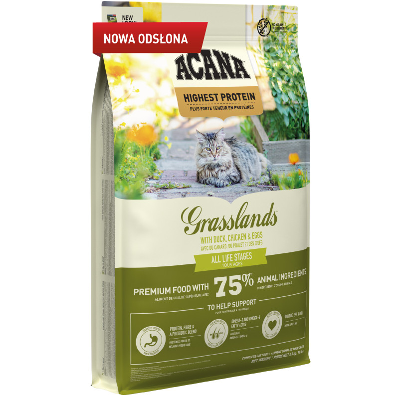 Karma bezzbożowa Acana Grasslands dla kotów zawiera niezrównaną różnorodność mięsnych składników, dostarczanych przez ludzi, których znamy i którym ufamy. Zaklasyfikowane są jako zdatne do spożycia przez ludzi i dostarczane do naszej wielokrotnie nagradzanej kuchni NorthStar każdego dnia.