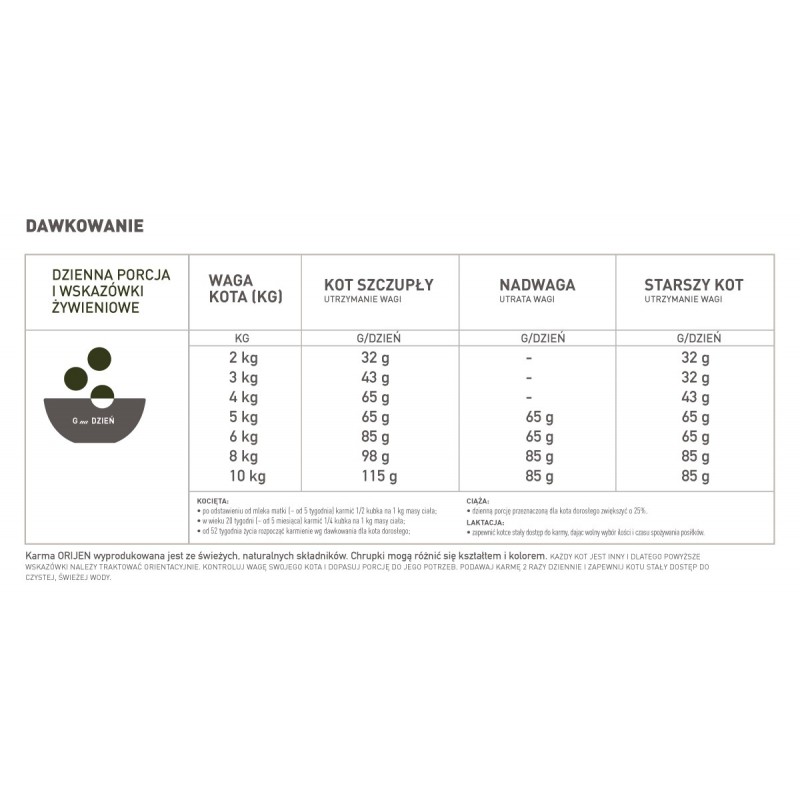 Układ pokarmowy wszystkich kotów – został ewolucyjnie przystosowany do spożywania i trawienia mięsa. W karmach Orijen nie ma zbóż, które wywołują alergię i są ciężko strawne. Zboża w karmie powodują wzdęcia oraz utrudniają wchłanianie wartościowych składników. W Karmach dla kotów Orijen zastąpiono popularne zboża: odżywczymi ziołami, warzywami, które uzupełniają dietę kota w niezbędne składniki, takie jak: arginina, witamina A, tauryna, itp.