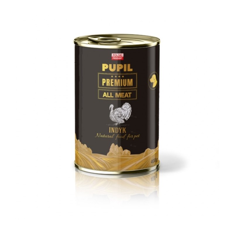 PUPIL Premium ALL MEAT GOLD indyk to lekkostrawny, zrównoważony i pełnoporcjowy posiłek stworzony z myślą o dorosłych psach. Receptura bogata w białko zwierzęce oraz dobrej jakości tłuszcze, jest gwarancją zdrowia i witalności. ALL MEAT GOLD to danie z wysoką zawartością mięsa indyczego poddanego delikatnej obróbce, która zapewnia doskonałą strawność oraz bardzo dobrą przyswajalność składników odżywczych. Chude mięso z indyka jest lekkostrawne, a przy tym posiada wysoką wartość odżywczą. Jest także cennym źródłem aminokwasów, magnezu, potasu, cynku oraz witamin z grupy B wspierających układ odpornościowy.