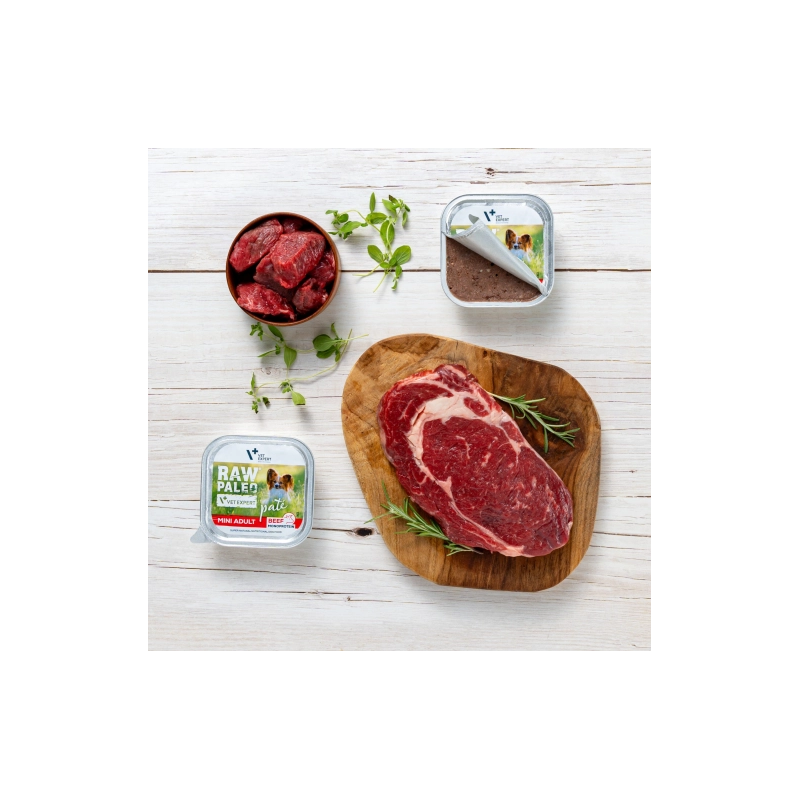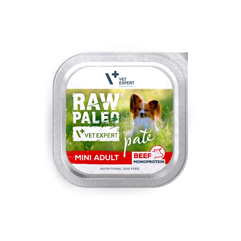 Karma Raw Paleo Pate Mini Adult Beef jest kompletną i zbilansowaną karmą, w postaci delikatnego i wyjątkowo smakowitego pasztetu, przeznaczoną dla zdrowych dorosłych psów ras małych. Receptura karmy oparta jest tylko na jednym źródle białka zwierzęcego, którym jest wołowina, co pomaga ograniczyć ryzyko wystąpienia alergii pokarmowych. Bez dodatku zbóż.