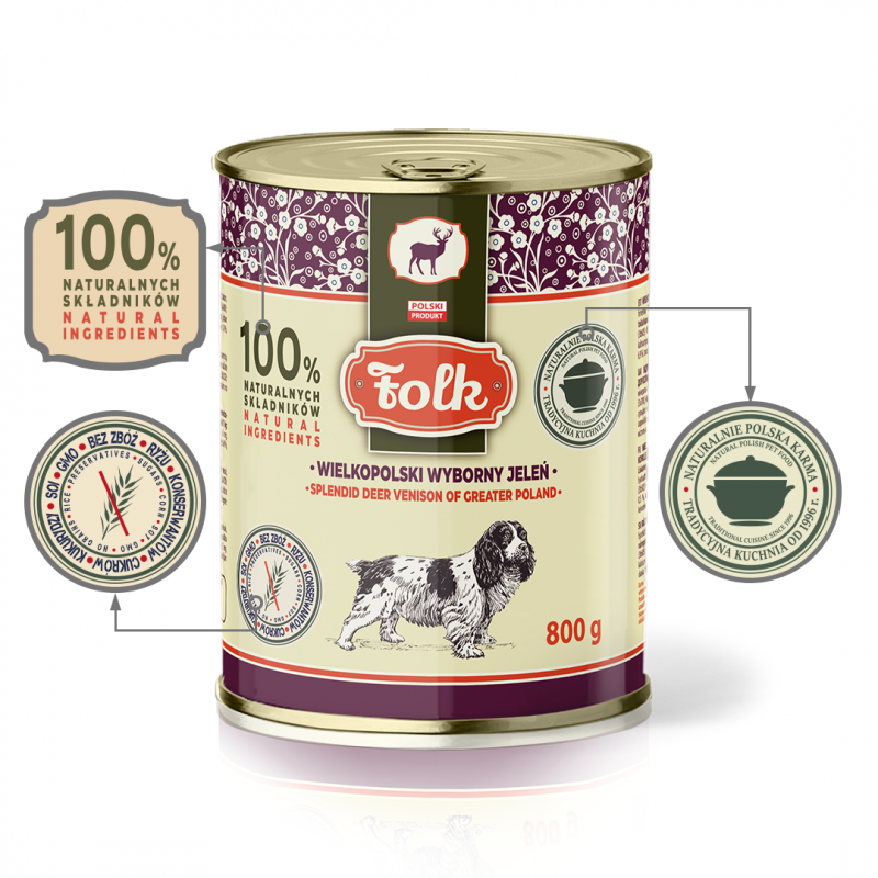 Korzyści, które zapewnia karma mokra FOLK Wielkopolski wyborny jeleń 400g: