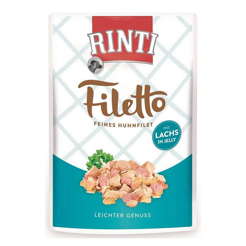 Mokra karma Rinti Filetto z kurczakiem i łososiem w galaretce jest naturalną karmą przeznaczoną dla psów dorosłych wszystkich ras. Wysokiej jakości karma składa się z delikatnego filetu z kurczaka z dodatkiem łososia. Receptura stworzona tylko z naturalnych składników, bez dodatku sztucznych barwników, bez konserwantów oraz bez dodatku soi.