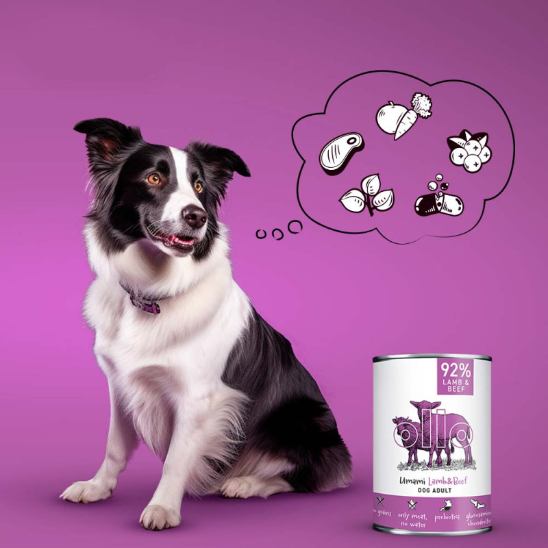 Ollo Umami Lamb & Beef – Jagnięcina i Wołowina to kompletna, pełnoporcjowa karma mokra dla psów dorosłych wszystkich ras. Bez dodatku wody czy buliony, by niepotrzebnie nie rozcieńczać mięsa. Idealna dla psów z wrażliwym przewodem pokarmowym. Dodatkowe wsparcie stawów, sierści i skóry oraz układu pokarmowego oraz moczowego. Nie zawiera zbóż, glutenu, oraz roślin strączkowych. Wszystkie składniki są naturalne. Bardzo bogata mieszanka ziół, witamin i minerałów, niespotykana w innych karmach.