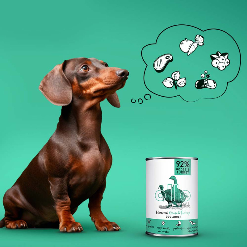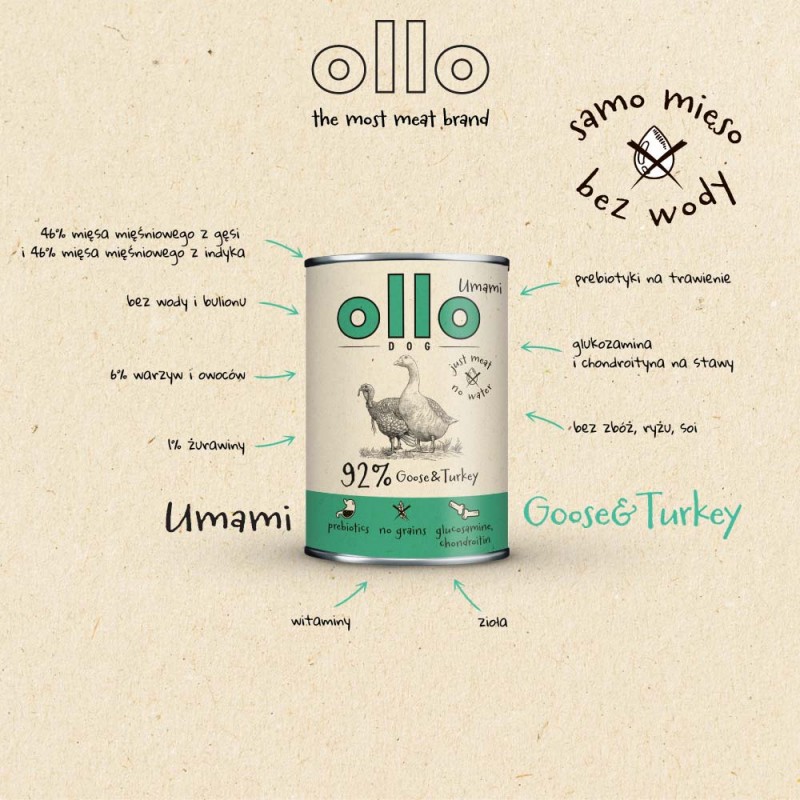 Ollo Umami Power Goose & Turkey – Gęś i Indyk to kompletna, pełnoporcjowa karma mokra dla psów dorosłych wszystkich ras. Bez dodatku wody czy buliony, by niepotrzebnie nie rozcieńczać mięsa. Karma bytowa dla każdego dorosłego psa, w szczególności dla psów, które potrzebują energetycznego posiłku, ze względu na zwiększoną ilość energii. Idealna dla psów z wrażliwym przewodem pokarmowym. Dodatkowe wsparcie stawów, sierści i skóry oraz układu pokarmowego oraz moczowego. Nie zawiera zbóż, glutenu, oraz roślin strączkowych. Wszystkie składniki są naturalne. Bardzo bogata mieszanka ziół, witamin i minerałów, niespotykana w innych karmach.