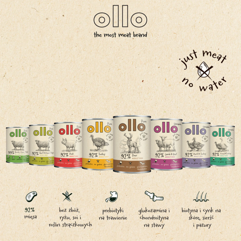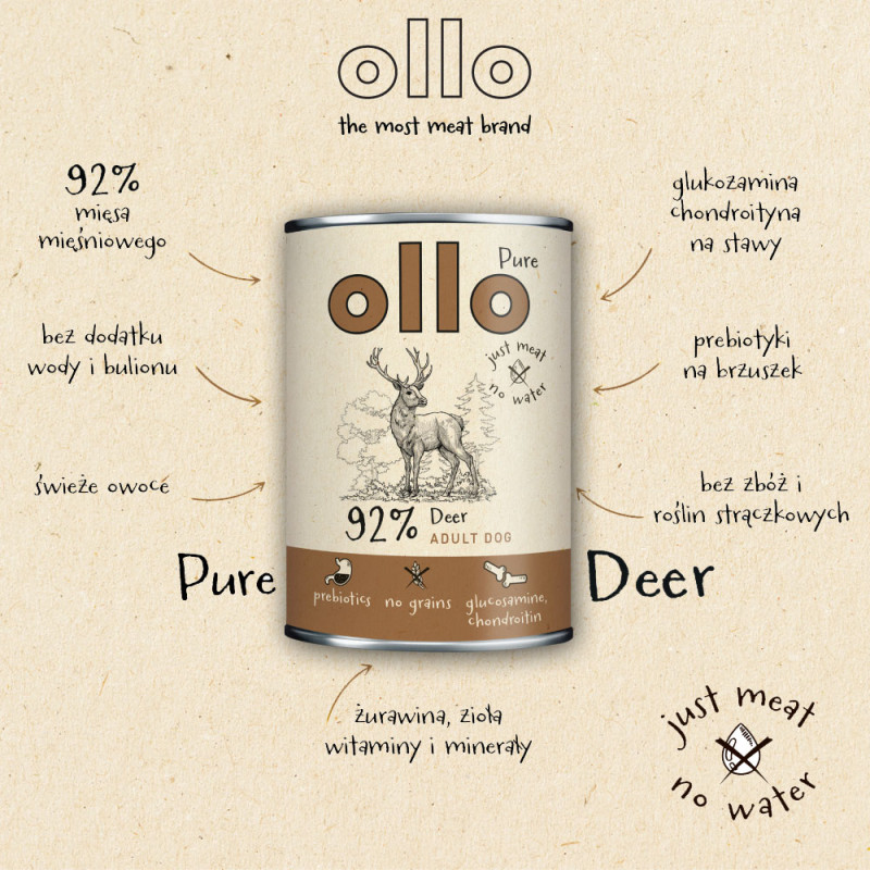 Ollo Pure Deer - Jeleń to kompletna, pełnoporcjowa karma mokra dla psów dorosłych wszystkich ras. Bez dodatku wody czy bulionu, by niepotrzebnie nie rozcieńczać mięsa. Formuła monobiałkowa wskazana dla psów z alergią pokarmową. Idealna dla psów z wrażliwym przewodem pokarmowym. Dodatkowe wsparcie stawów, sierści i skóry oraz układu pokarmowego oraz moczowego. Nie zawiera zbóż, glutenu, oraz roślin strączkowych. Wszystkie składniki są naturalne. Bardzo bogata mieszanka ziół, witamin i minerałów, niespotykana w innych karmach.