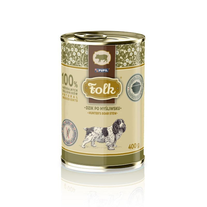 FOLK Dzik po myśliwsku to pełnoporcjowa mokra karma dla dorosłych psów, z wysoką zawartością mięsa z dzika. Dziczyzna jest lekkostrawna i bogata w aminokwasy, fosfor, wapń, magnez oraz witaminy z grupy B. Karma charakteryzuje się wysoką strawnością, co widać po właściwej konsystencji psiego stolca.
