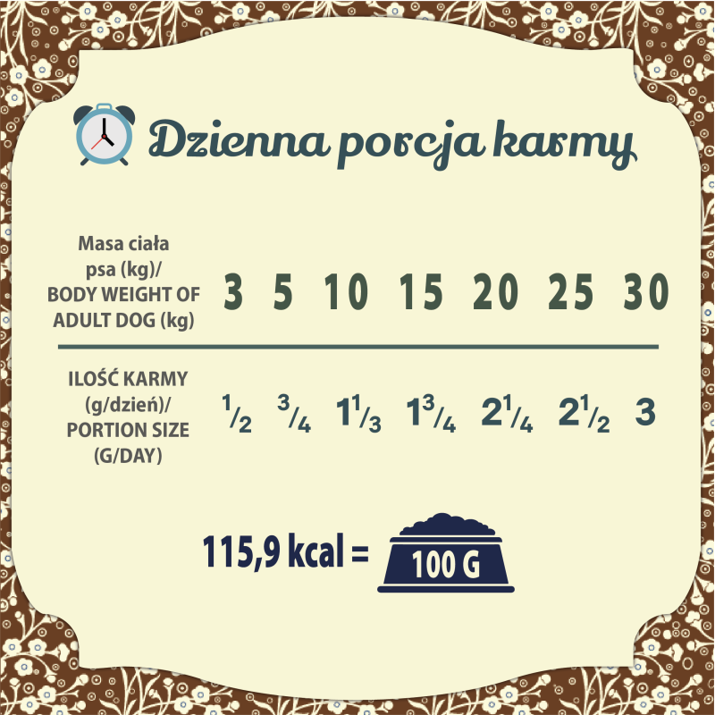Skład: Dziczyzna 70% (mięso z dzika, wątróbka, serca), bulion, dynia, olej z łososia 0,3%, rozmaryn, substancje mineralne.