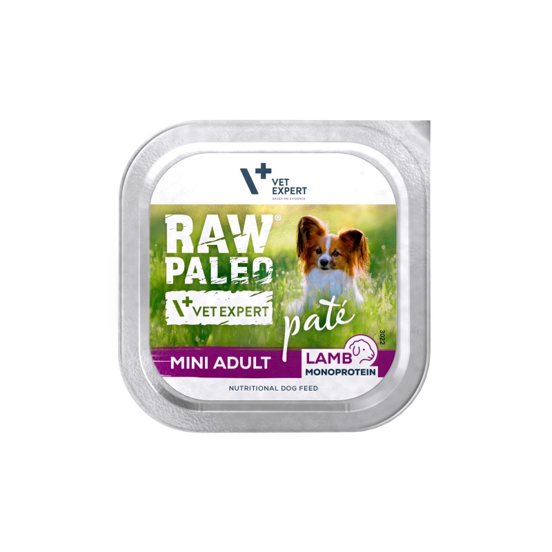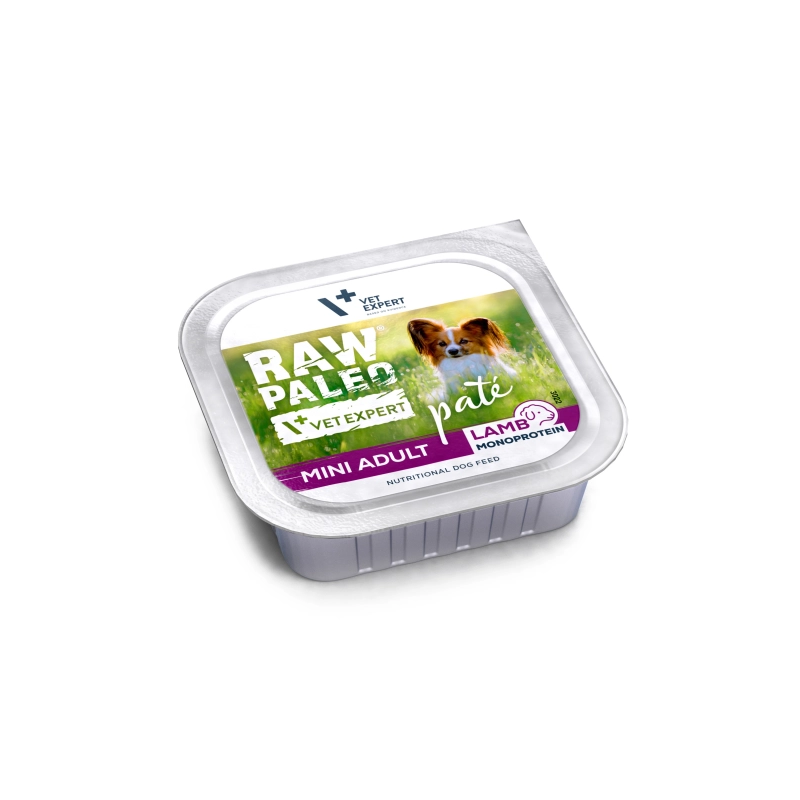 Karma Raw Paleo Pate Mini Adult Lamb jest kompletną i zbilansowaną karmą, w postaci delikatnego i wyjątkowo smakowitego pasztetu, przeznaczoną dla zdrowych dorosłych psów ras małych. Receptura karmy oparta jest tylko na jednym źródle białka zwierzęcego, którym jest jagnięcina, co pomaga ograniczyć ryzyko wystąpienia alergii pokarmowych. Bez dodatku zbóż.