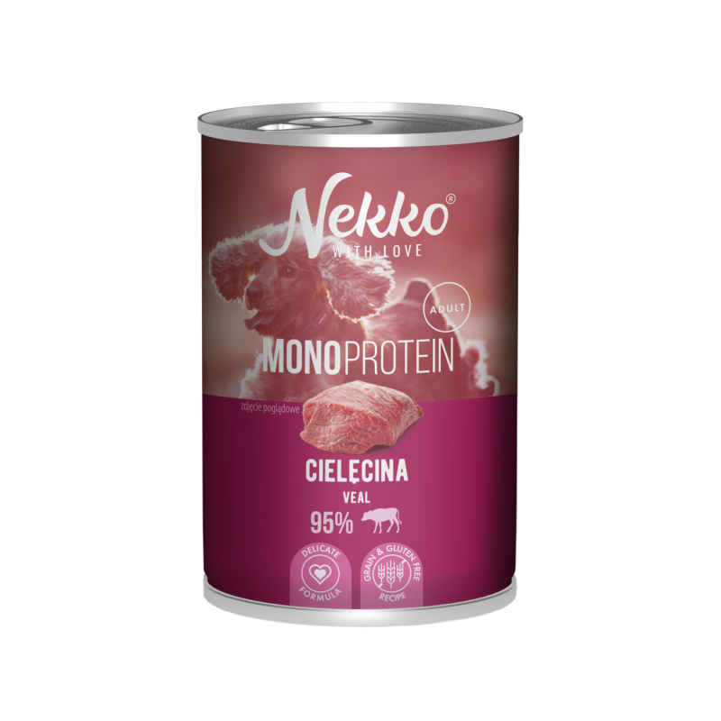 Karma mokra pełnoporcjowa Nekko Mono dla psów dorosłych wszystkich ras. Zawiera jeden składnik pochodzenia zwierzęcego. Doskonale sprawdzi się jako kompletny codzienny posiłek.