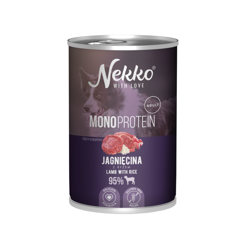 Karma mokra pełnoporcjowa Nekko Mono dla psów dorosłych wszystkich ras. Zawiera jeden składnik pochodzenia zwierzęcego. Doskonale sprawdzi się jako kompletny codzienny posiłek.