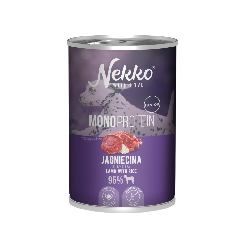 Karma mokra pełnoporcjowa Nekko Mono dla szczeniąt i młodych psów wszystkich ras. Zawiera jeden składnik pochodzenia zwierzęcego. Doskonale sprawdzi się jako kompletny codzienny posiłek.