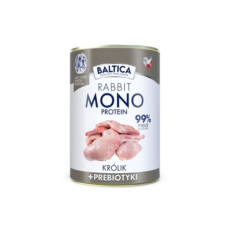 Mokra Karma Baltica Nutraceutic to bezzbożowa, wysokomięsna karma mokra Super Premium stworzona na bazie mięsa królika z dodatkiem prebiotyków MOS i FOS wspomagających układ trawienny.