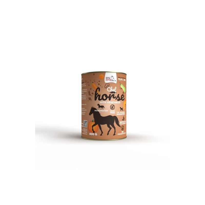 Koń z warzywami to zdrowa, smaczna i pełnoporcjowa karma mokra dla dorosłych psów, której skład został opracowany przez naszego specjalistę żywienia psów. Wybierając właśnie tę karmę możesz mieć pewność, że do organizmu Twojego pupila zostaną dostarczone wszystkie niezbędne składniki odżywcze, witaminy i minerały.