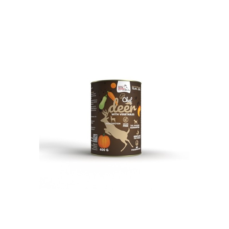W linii Chef od Sytej Michy znajduje się aż 92,6% produktów pochodzenia zwierzęcego, w stosunku 72.6% mięsa mięśniowego z jelenia do 20% jelenich podrobów (10% żołądki, 5% serca, 5% wątróbka).