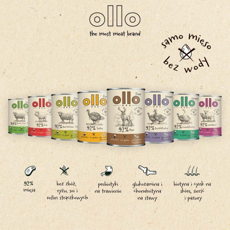 Ollo Pure Turkey – Indyk to kompletna, pełnoporcjowa karma mokra dla psów dorosłych wszystkich ras. Bez dodatku wody czy buliony, by niepotrzebnie nie rozcieńczać mięsa. Formuła monobiałkowa wskazana dla psów z alergią pokarmową. Idealna dla psów z wrażliwym przewodem pokarmowym. Dodatkowe wsparcie stawów, sierści i skóry oraz układu pokarmowego oraz moczowego. Nie zawiera zbóż, glutenu, oraz roślin strączkowych. Wszystkie składniki są naturalne. Bardzo bogata mieszanka ziół, witamin i minerałów, niespotykana w innych karmach.