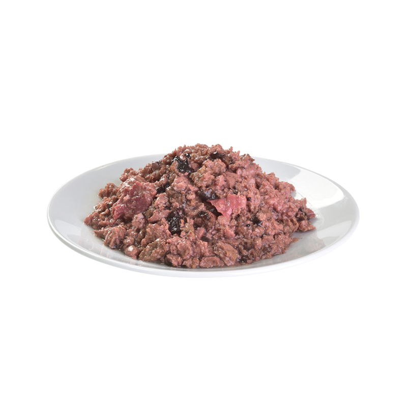 Skład: 85% mięso i produkty uboczne pochodzenia zwierzęcego w filetach (8% jagnięcina), 9,6% sos mięsny, 1,5% zioła i owoce (goździki, cytrusy, rozmaryn, kurkuma), 0,5% jagody, 1% minerały, 1% olej z łososia 0,5% mannanoligosacharydów 0,5% fruktooligosacharydów 0,4% inuliny
