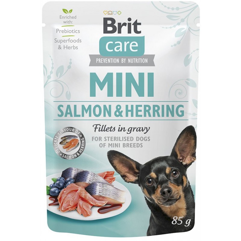 Karma mokra, pełnoporcjowa dla dorosłych psów ras małych i miniaturowych, z łososiem i śledziem w sosie własnym.